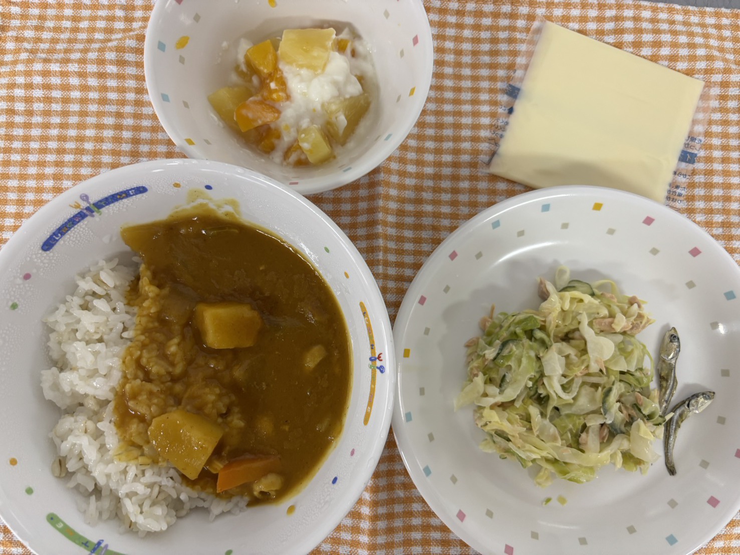 【給食】・チキンカレーライス ・ツナサラダ ・フルーツヨーグルト ・チーズ・いりこ 【おやつ】・お茶 りんごゼリー