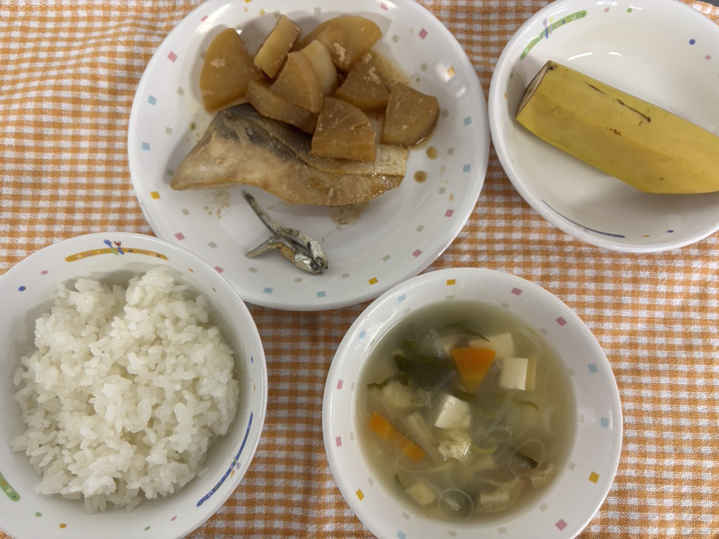 【給食】・ごはん ・ぶり大根 ・長ねぎのおみそ汁 ・バナナ・いりこ 【おやつ】・牛乳・スイートポテト