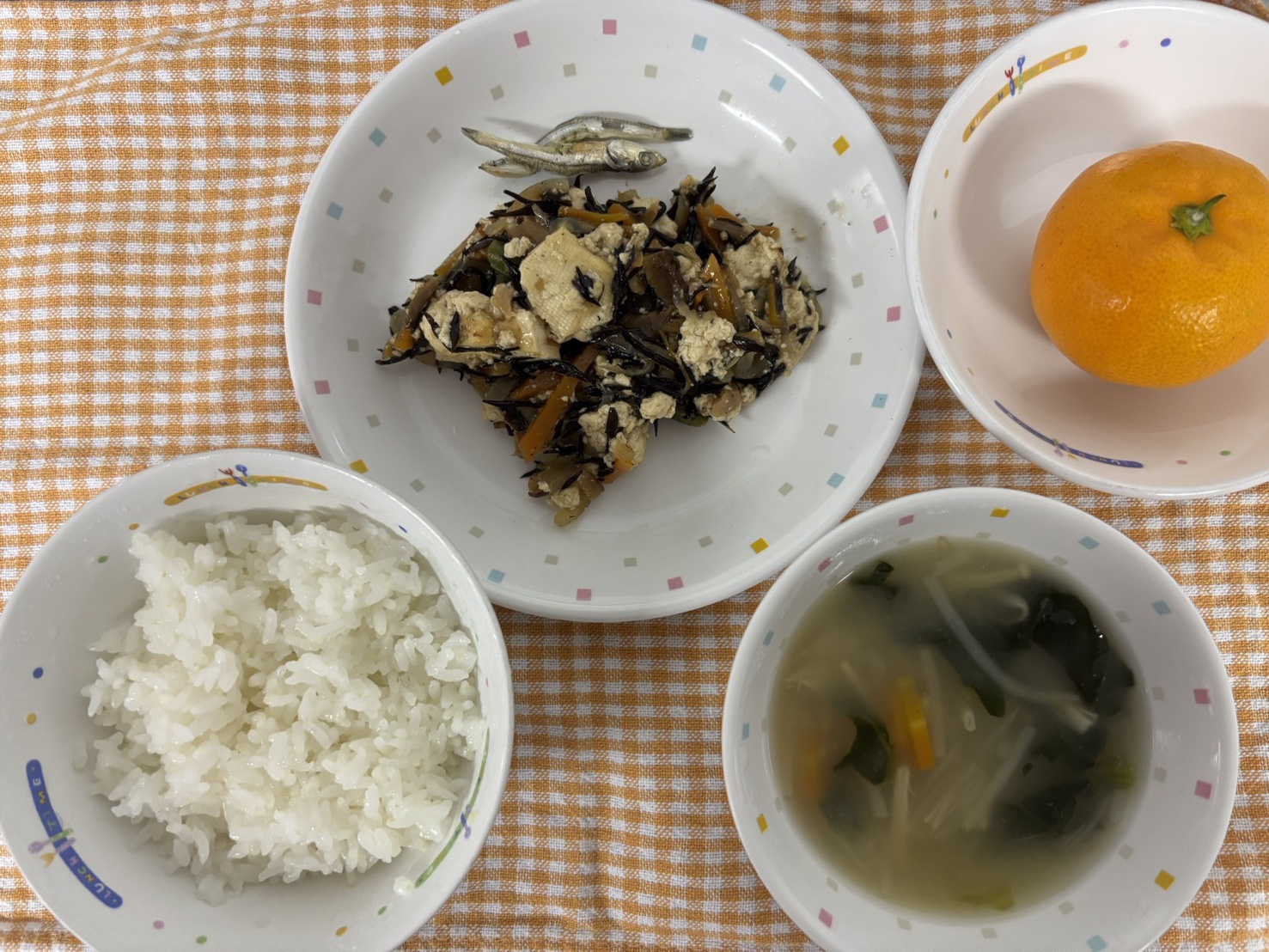【給食】・ごはん ・炒り豆腐 ・ほうれん草のおみそ汁 ・みかん・いりこ 【おやつ】・牛乳・いももち