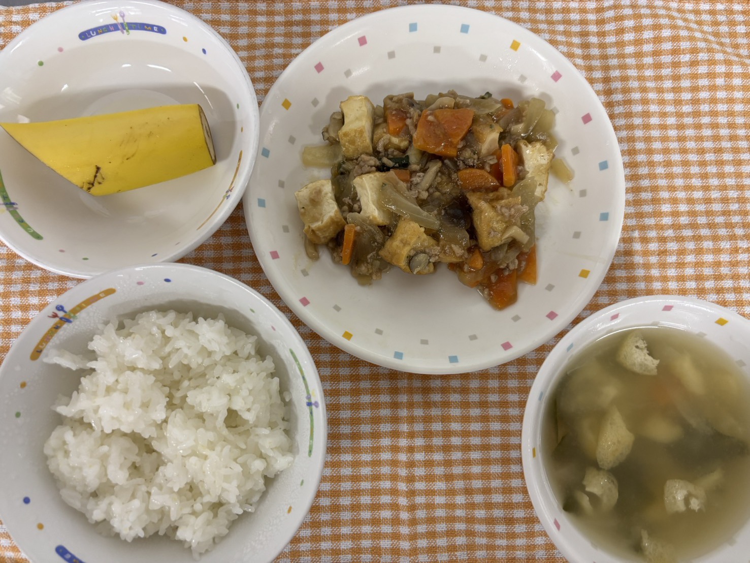 【給食】・ごはん ・厚揚げの炒め物 ・里芋のおみそ汁 ・バナナ・いりこ 【おやつ】・牛乳 ・セレクトサンドイッチ