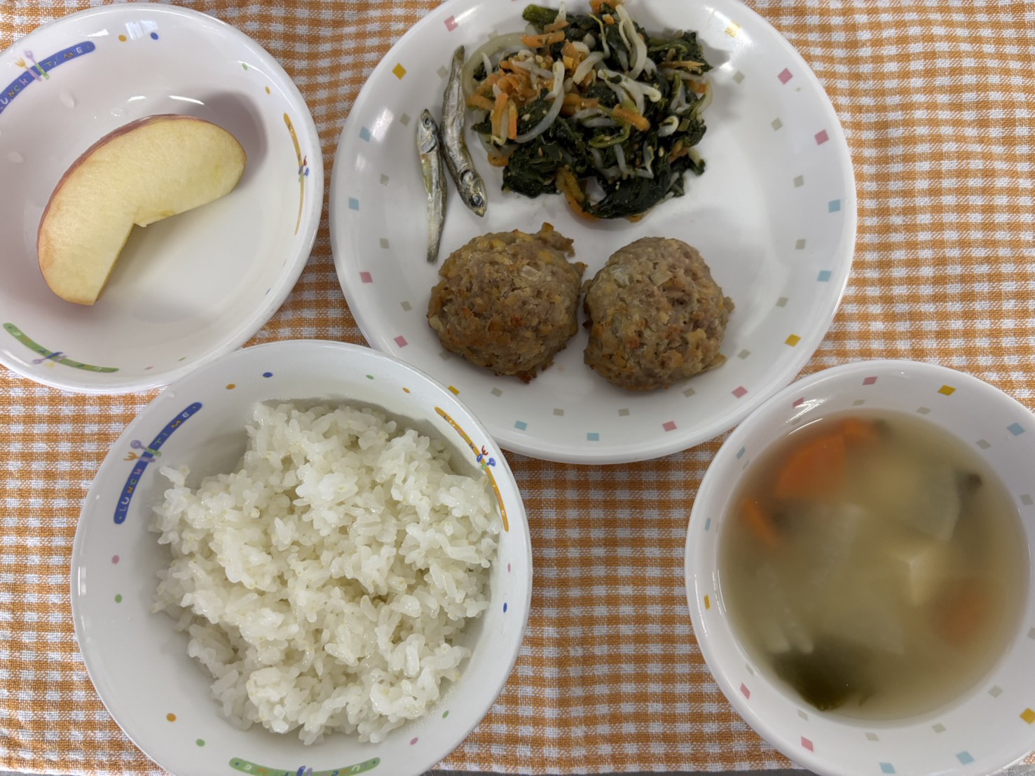 【給食】・ごはん ・納豆ボール ・ごまず和え ・大根のおみそ汁 ・りんご・いりこ 【おやつ】・牛乳・蒸し芋
