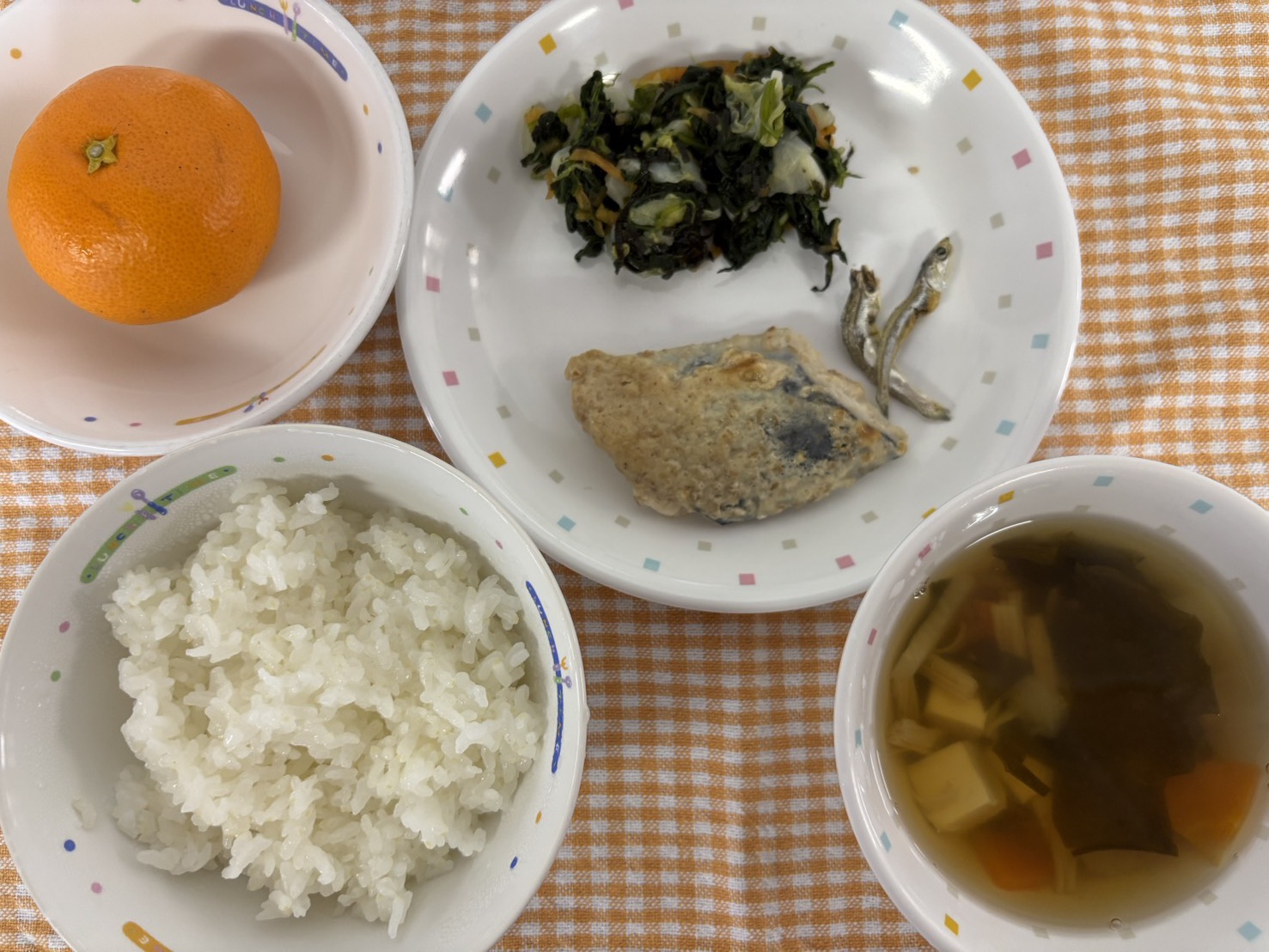 【給食】・ごはん ・さわらのごまみそ焼き ・塩磯和え ・かぶのすまし汁 ・みかん・いりこ 【おやつ】・牛乳・りんごケーキ