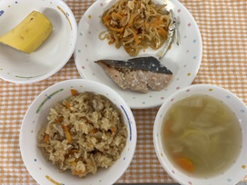 【給食】・鶏ごぼうごはん ・鮭の塩麹焼き ・切干大根の旨煮 ・白菜のおみそ汁 ・バナナ・いりこ 【おやつ】・牛乳・ベイクドじゃが