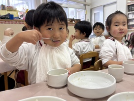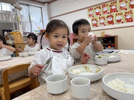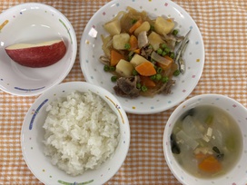 2026年01月21日(水) 給食ブログ NEW 2026/1/21 今日のお味噌汁は、4年保育さんが収穫してくれた大根をたっぷりいれました。 【給食】・ごはん ・肉じゃが ・小松菜のおみそ汁 ・バナナ・いりこ 【おやつ】・牛乳・セレクトサンドイッチ