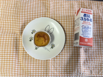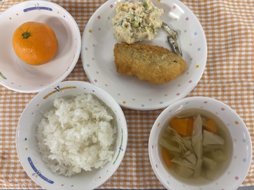 【給食】・ごはん ・白身魚のフライ ・ポテトサラダ ・コンソメスープ ・みかん・いりこ 【おやつ】・牛乳・かぼちゃケーキ