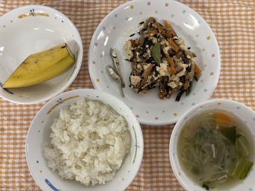 【給食】・ごはん ・炒り豆腐 ・春雨スープ ・バナナ・いりこ 【おやつ】・牛乳・米粉クッキー