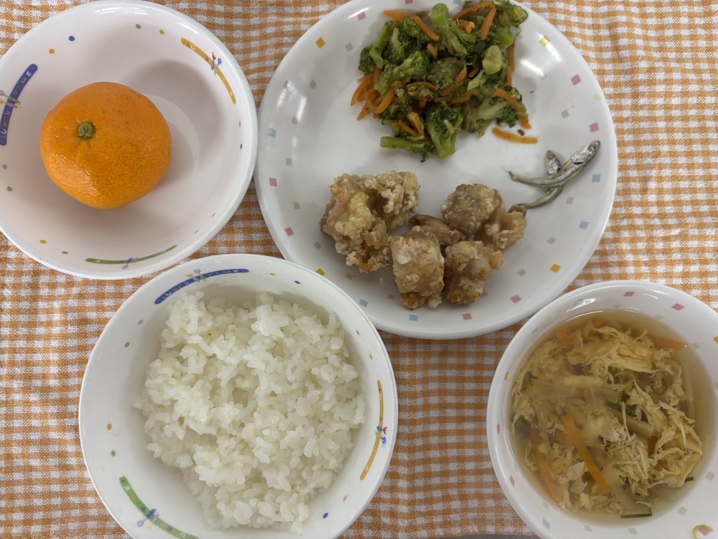 2026年01月29日(木) 給食ブログ NEW 2026/1/29 【給食】・ごはん ・鶏のからあげ ・ブロッコリーと人参のおかか和え ・かきたま汁 ・みかん・いりこ 【おやつ】・お茶・フルーツきんとん
