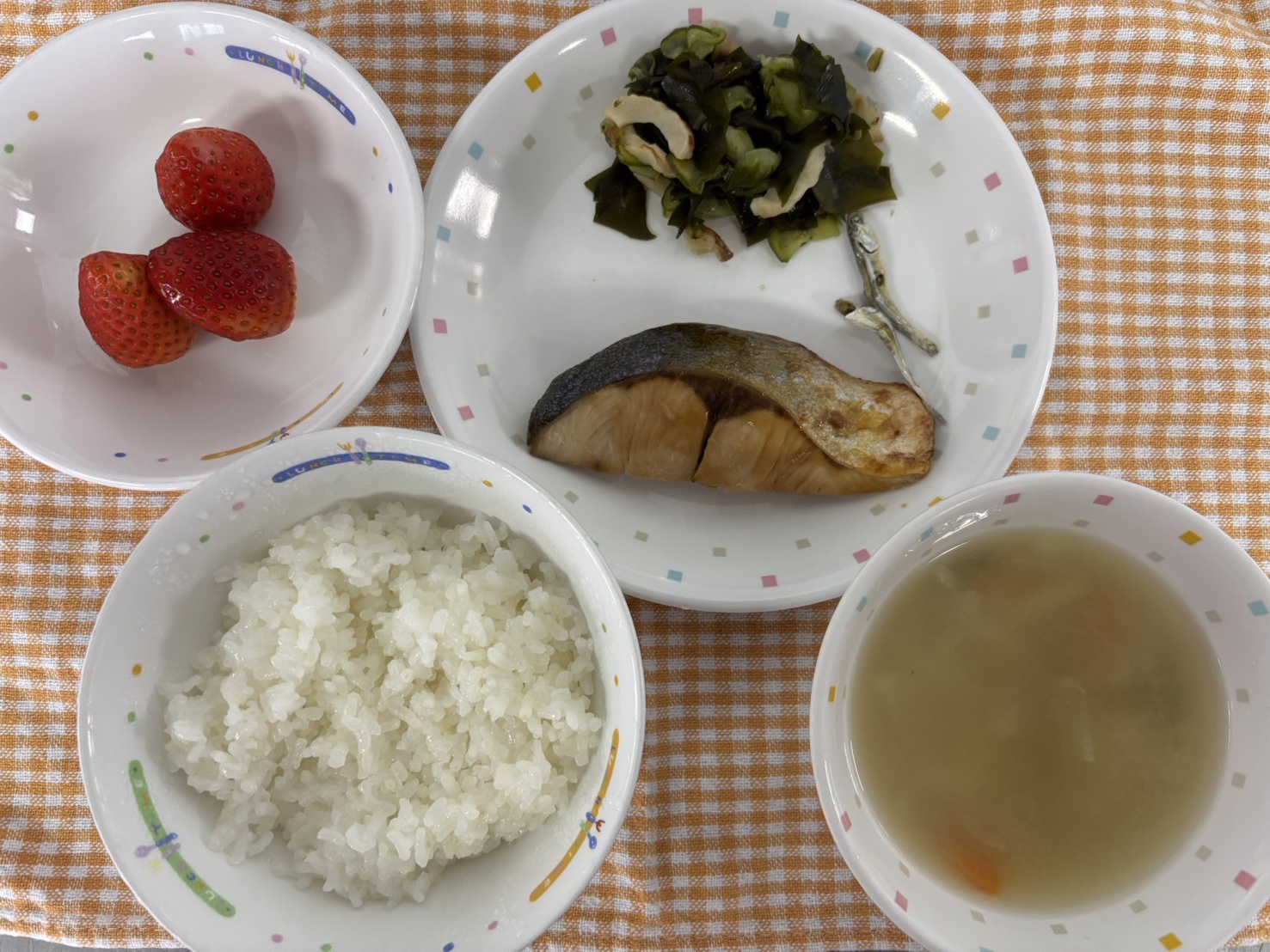 【給食】・ごはん ・ぶりの照り焼き ・わかめの酢の物 ・大根のおみそ汁 ・いちご・いりこ 【おやつ】・牛乳・マヨコーンケーキ