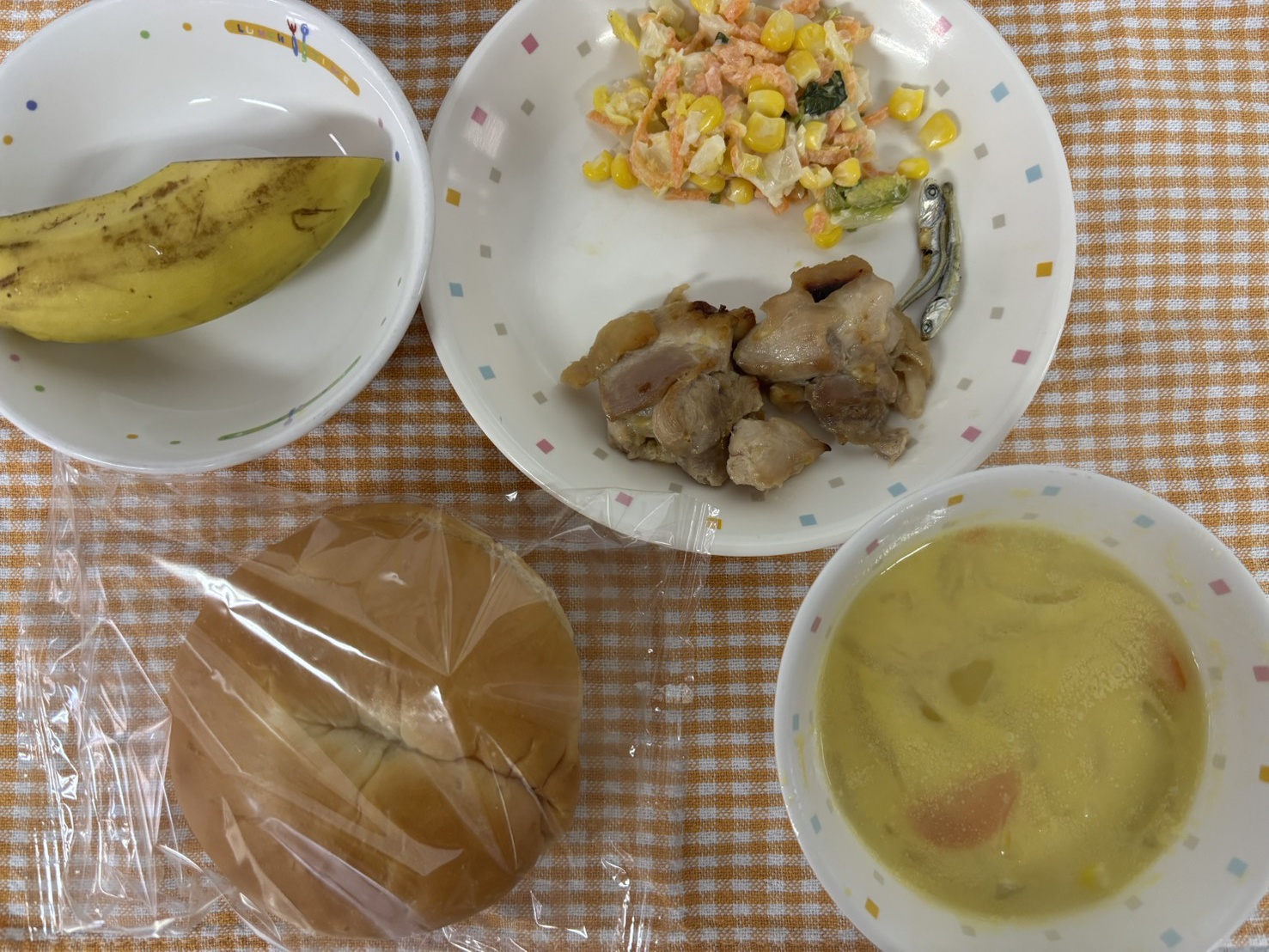 【給食】・パン ・鶏肉のマーマレード焼き ・コールスローサラダ ・コーンスープ ・バナナ・いりこ 【おやつ】・お茶・ゆかりおむすび