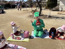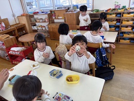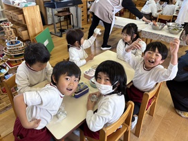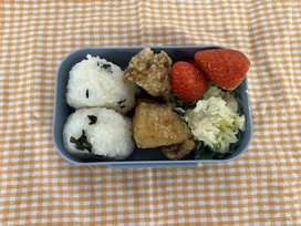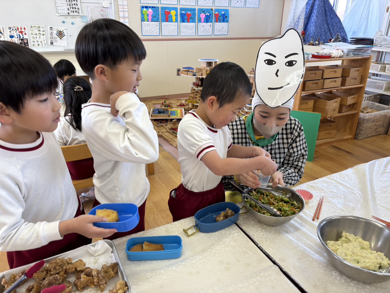 2026年02月17日(火) 給食ブログ NEW 2026/2/17 ☆セレクト空弁当の日 【給食】・わかめおむすび・塩おむすび ・白身魚のフライorとりのから揚げ ・ポテトサラダorブロッコリーのサラダ ・いちご・いりこ ※おかずとサラダはどちらか1つ 【おやつ】・お茶 ・セレクトサンドイッチ(いちごジャム・りんごジャム) 今日は、山口県立大学から食育戦隊ゴハンジャーが来てくださいました! ブロッコリーのサラダいっぱいいれるよ おむすびをハート型や丸形、三角形、みんな好きな形に作っていました。 きれいな丸にできたよ! おいしいね! ピーコといっしょに!