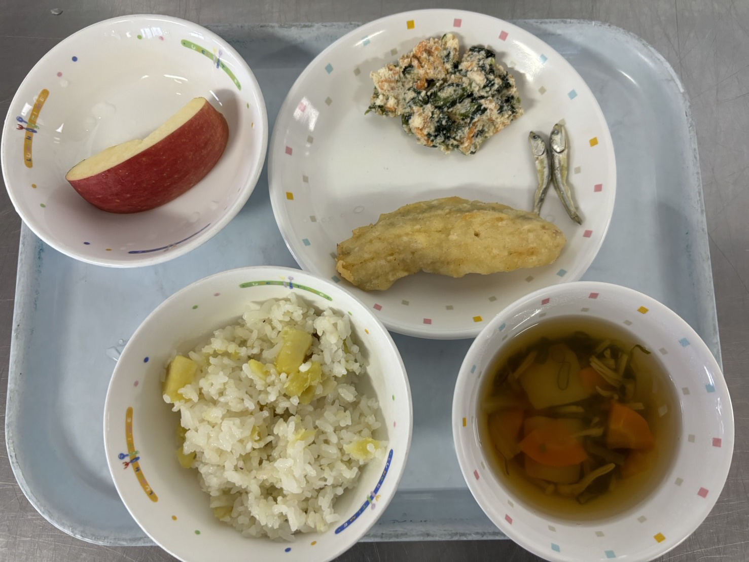 2025年06月04日(水) 給食ブログ 2025/6/4 しっかり噛むことを意識したメニューです ☆カミカミメニュー 【給食】・ごはん ・鶏肉のから揚げ ・切干大根のカミカミサラダ ・えのきのすまし汁 ・メロン・いりこ 【おやつ】・牛乳・いりこ しっかりかみかみ から揚げおいしい! おいしい~!