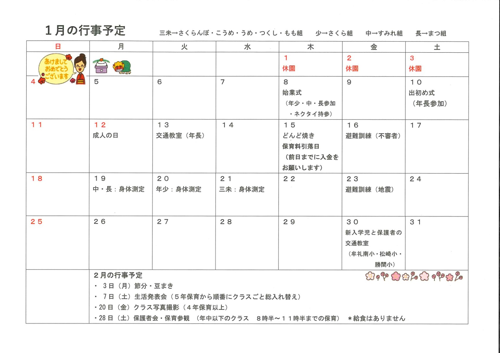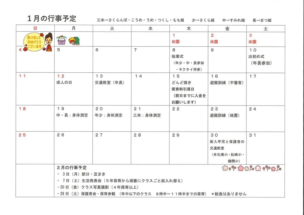 2026年01月08日(木) お知らせ 令和7年度 1月号クラスだより 「さくらんぼ組」(6年保育) 「うめ・こうめ組」(5年保育) 「もも・つくし組」(4年保育) 「さくら組」(年少組) 「すみれ組」(年中組) 「まつ組」(年長組)