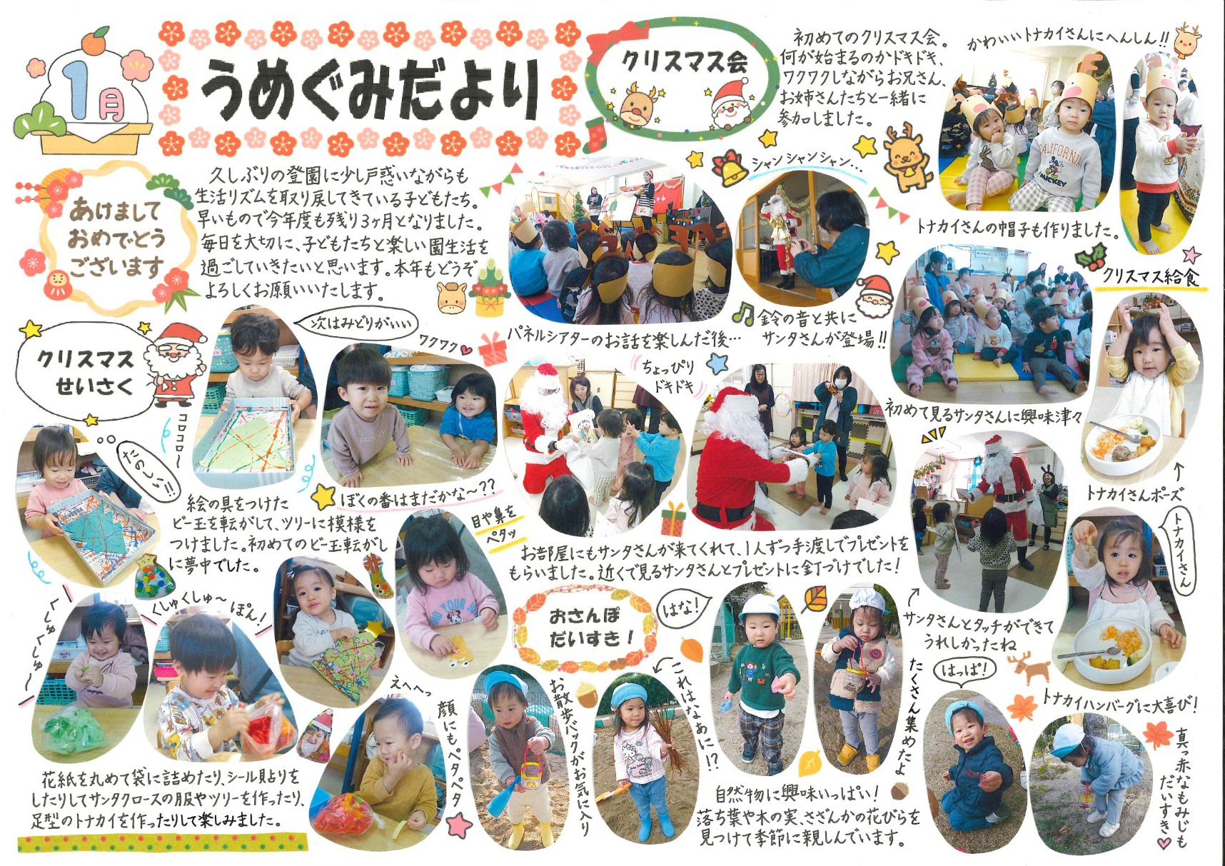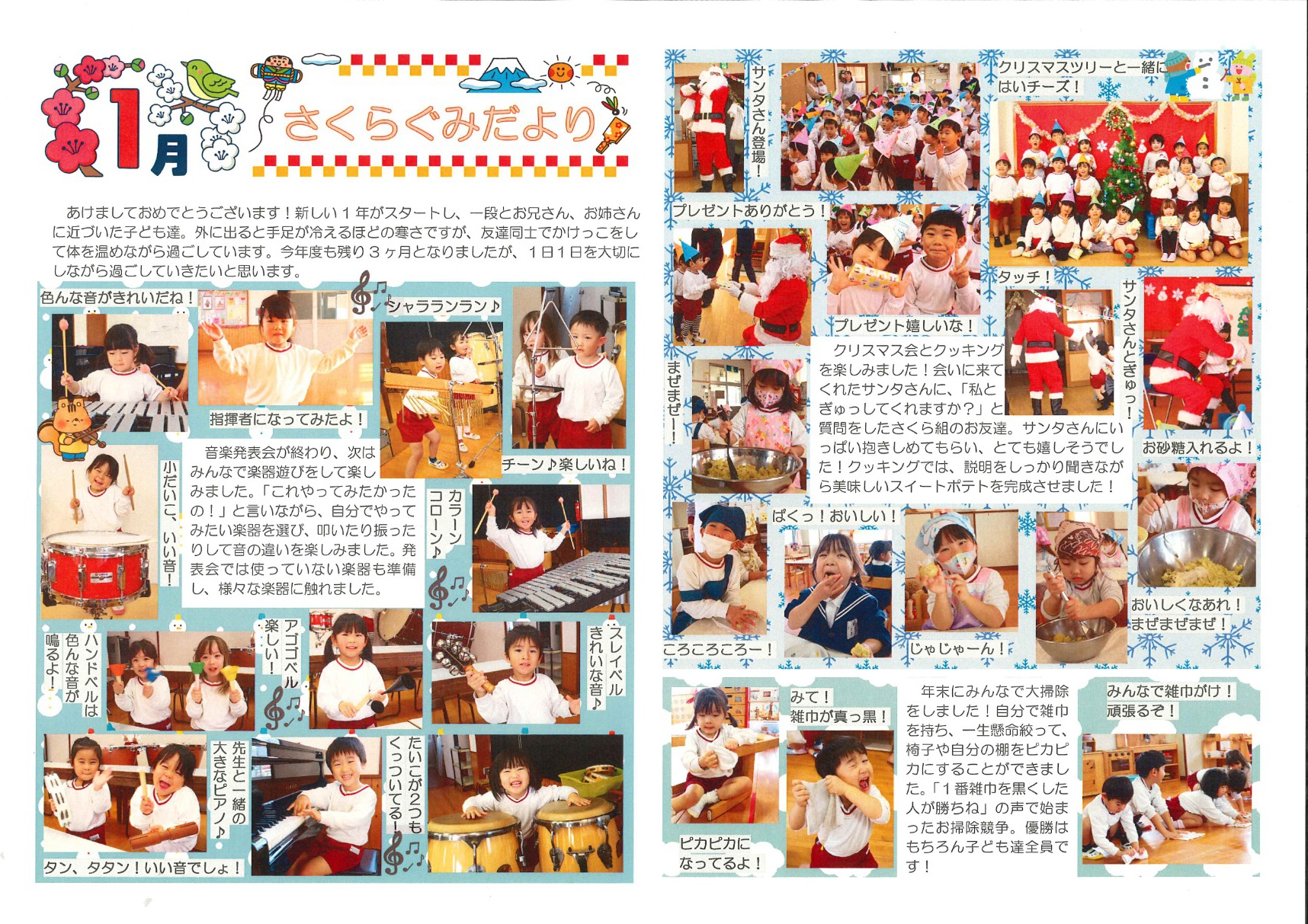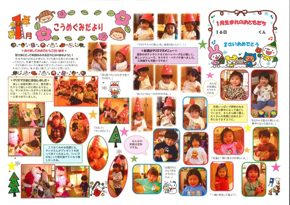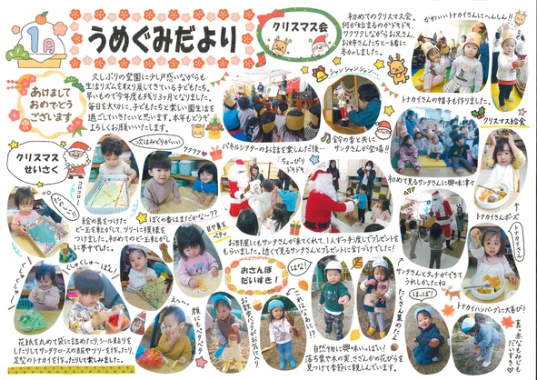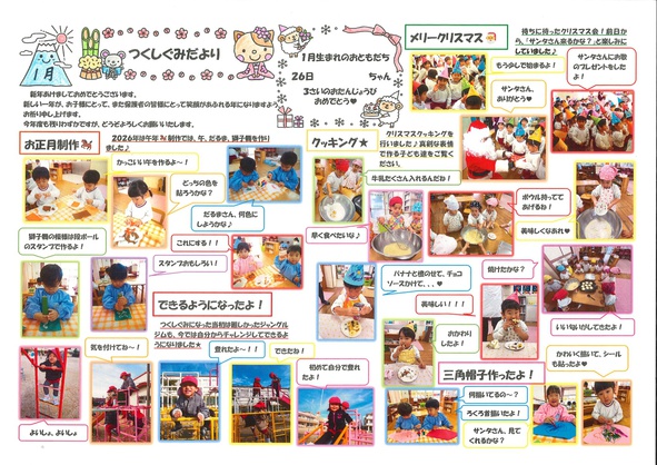 2026年01月08日(木) お知らせ NEW 令和7年度 1月号クラスだより 「さくらんぼ組」(6年保育) 「うめ・こうめ組」(5年保育) 「もも・つくし組」(4年保育) 「さくら組」(年少組) 「すみれ組」(年中組) 「まつ組」(年長組)