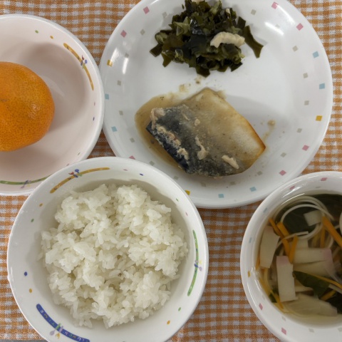 【給食】・ごはん ・さばのみそ煮 ・わかめの酢の物 ・そうめん汁 ・み...