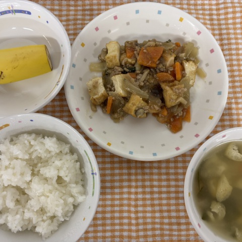 【給食】・ごはん ・厚揚げの炒め物 ・里芋のおみそ汁 ・バナナ・いりこ...