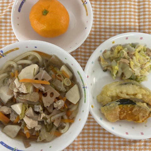 ☆冬至給食 【給食】・けんちんうどん ・南瓜の天ぷら ・白菜のツナゆず...