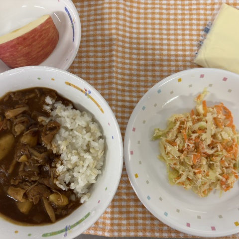 【給食】・ハヤシライス ・鶏ささみのしっとりサラダ ・チーズ ・りんご...