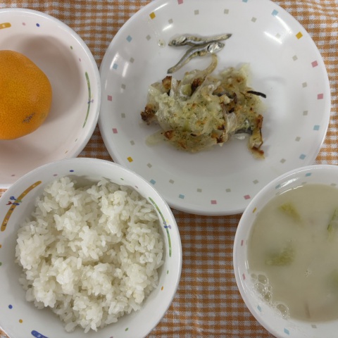 【給食】・ごはん ・たらのチーズ焼き ・かぼちゃの豆乳汁 ・みかん・い...
