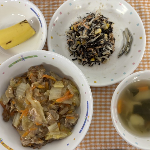 【給食】・白菜の中華丼 ・ひじきサラダ ・小松菜スープ ・バナナ・いり...