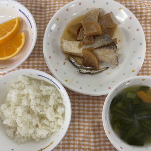 【給食】・ごはん ・ぶり大根 ・豆腐のおみそ汁 ・オレンジ・いりこ 【...