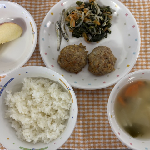 【給食】・ごはん ・納豆ボール ・ごまず和え ・大根のおみそ汁 ・りん...