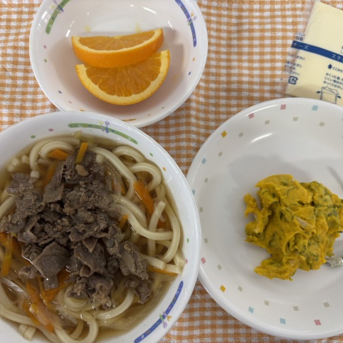 【給食】・肉うどん ・かぼちゃサラダ ・チーズ ・オレンジ・いりこ 【...