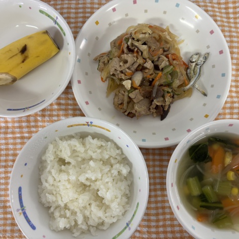 【給食】・ごはん ・豚肉と春雨の炒め物 ・ワンタンスープ ・バナナ・い...
