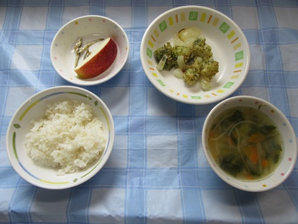 【昼食】ごはん・ホキのチーズ焼き・春雨スープ・りんご・いりこ