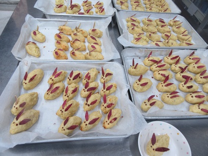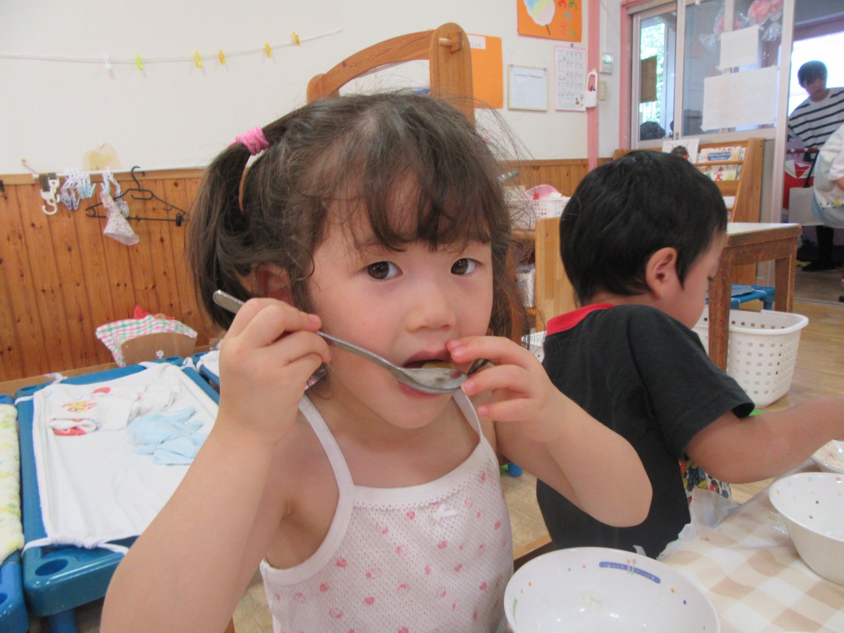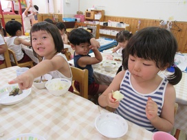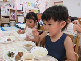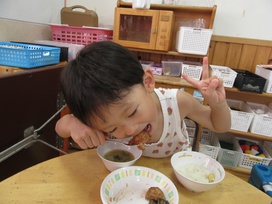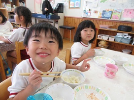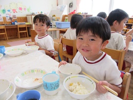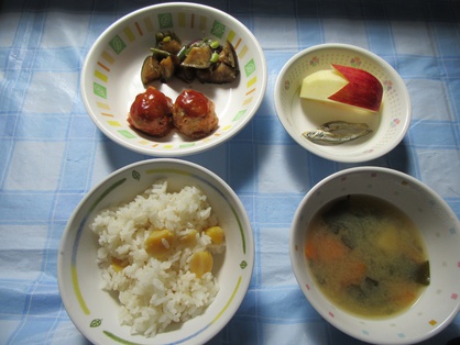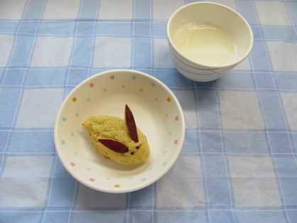 2025年10月06日(月) 給食ブログ 2025.10.6 お月見給食 【昼食】栗ごはん・ミートボール・揚げなす・里芋のお味噌汁・うさぎりんご・いりこ 【おやつ】カルピス・うさぎのスイートポテト 今夜は1年の中で1番きれいな満月が見える日「十五夜」です。今日のお月見給食は、まんまるお月様にみたてた大きなミートボールや、秋の収穫に感謝して供えられる里芋や栗を使った料理にしました。栗ごはんはあまり食べ馴染みがないようで、最初は子どもたちも警戒していましたが…、一口食べると「甘くておいしいね」「お月様の色みたいだね」と言いながらもりもり食べていました。今夜はぜひ月を眺めながら、お団子を食べてみてくださいね! おやつはうさぎのスイートポテトです。さつまいもの皮をうさぎの耳にみたてました。「かわいい~」「食べるのがもったいない!」と子どもたちは嬉しそうに話していました。