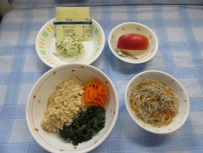【昼食】3色そぼろ丼・ハムサラダ・そうめん汁・チーズ・りんご・いりこ
