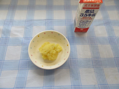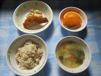【昼食】きのこごはん・白身魚フライ・ポテトサラダ・かぶのお味噌汁・オレンジ・いりこ