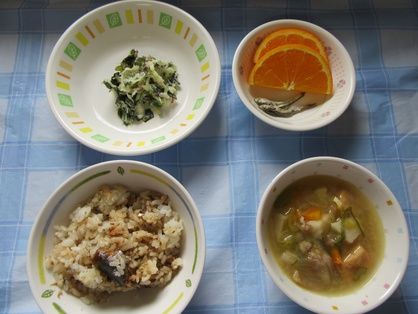2025年10月20日(月) 給食ブログ 2025.10.20 【昼食】さんまの混ぜごはん・海藻サラダ・いもこ汁・オレンジ・いりこ いもこ汁は山形県の郷土料理で、豚肉使用の味噌仕立ての庄内風と、牛肉使用の醤油仕立てが特徴の村山風があります。今日は厚揚げをたっぷり使った庄内風です。ゴロゴロっとした里芋が秋を感じさせてくれます。甘めの味付けで子どもたちも気に入ったようでした。