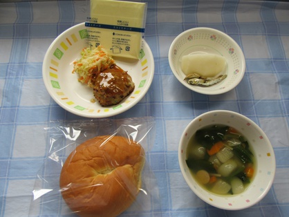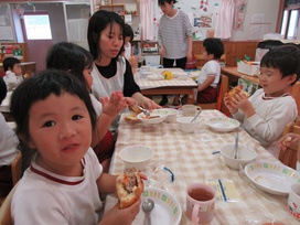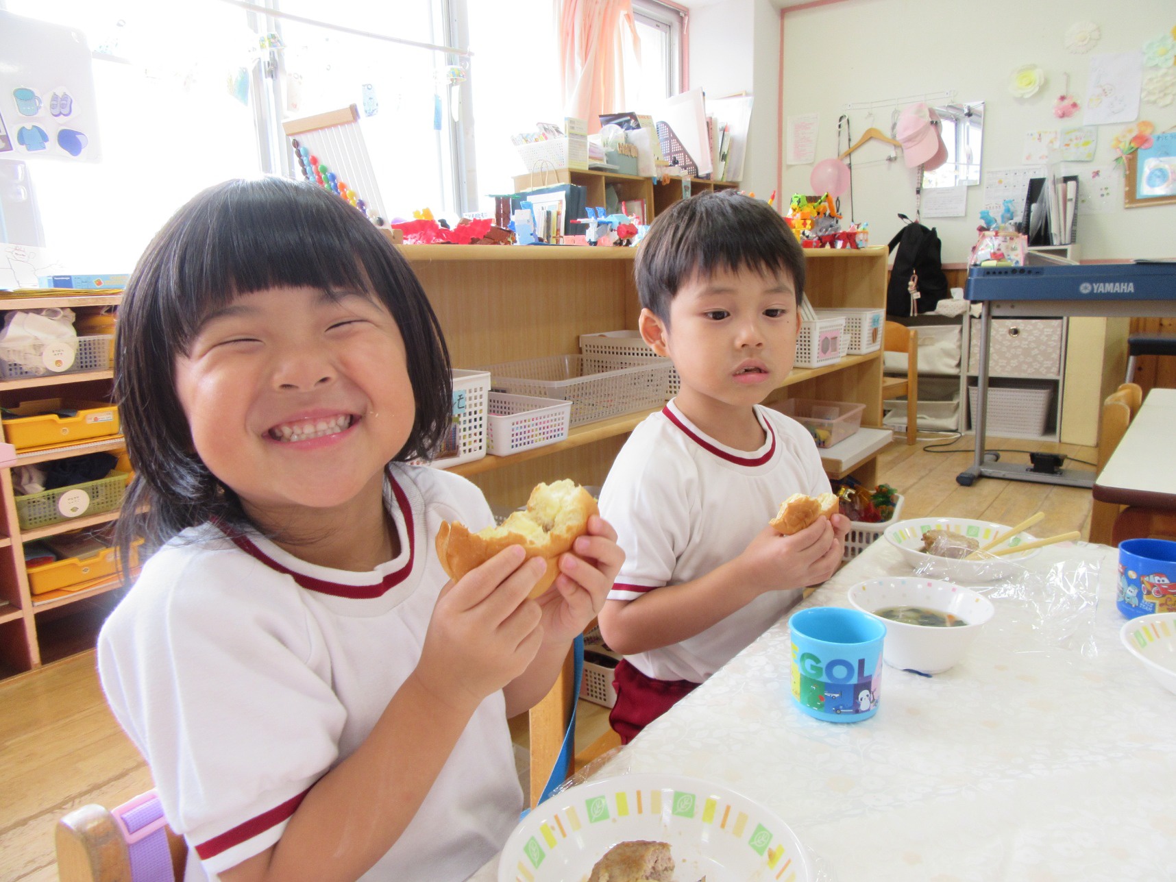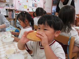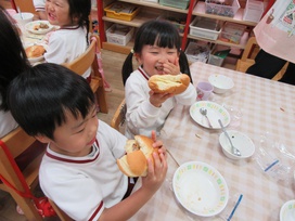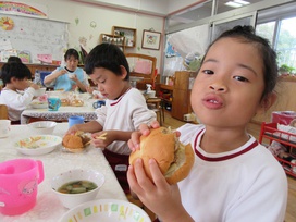 2025年10月22日(水) 給食ブログ NEW 2025.10.21 【昼食】パン・照り焼きハンバーグ・コールスローサラダ・秋野菜ポトフ・チーズ・なし・いりこ 【おやつ】お茶(未満児は牛乳)・わかめしらすおにぎり 年少組以上は、パンに切れ目を入れてセルフバーガーの日にしました。ハンバーグやサラダ、チーズを自分の好きなように挟みます。なんだかとっても嬉しそうな子どもたちの笑顔を見ることができました。