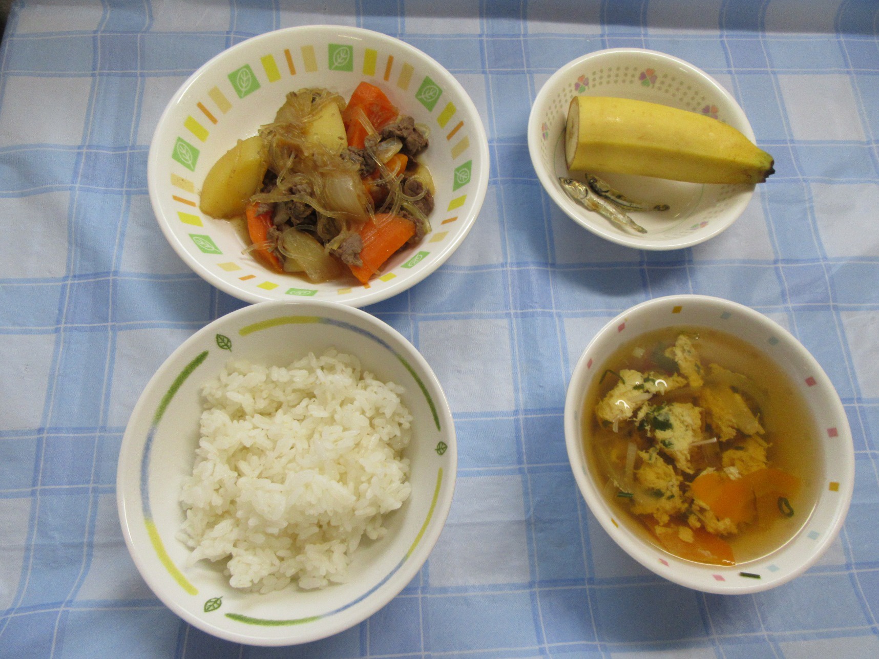 【昼食】ごはん・肉じゃが・かきたま汁・バナナ・いりこ