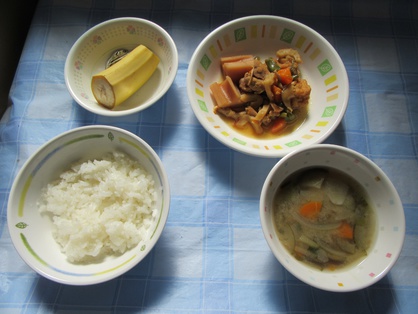 【昼食】ごはん・筑前煮・じゃが芋のお味噌汁・バナナ・いりこ
