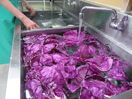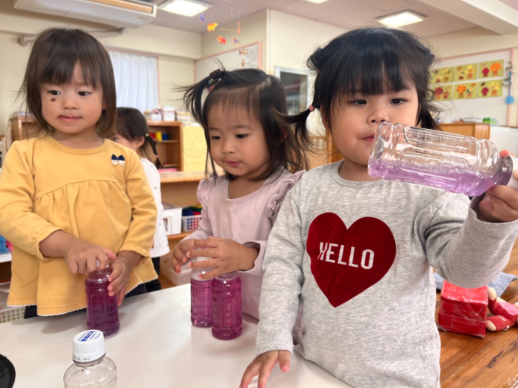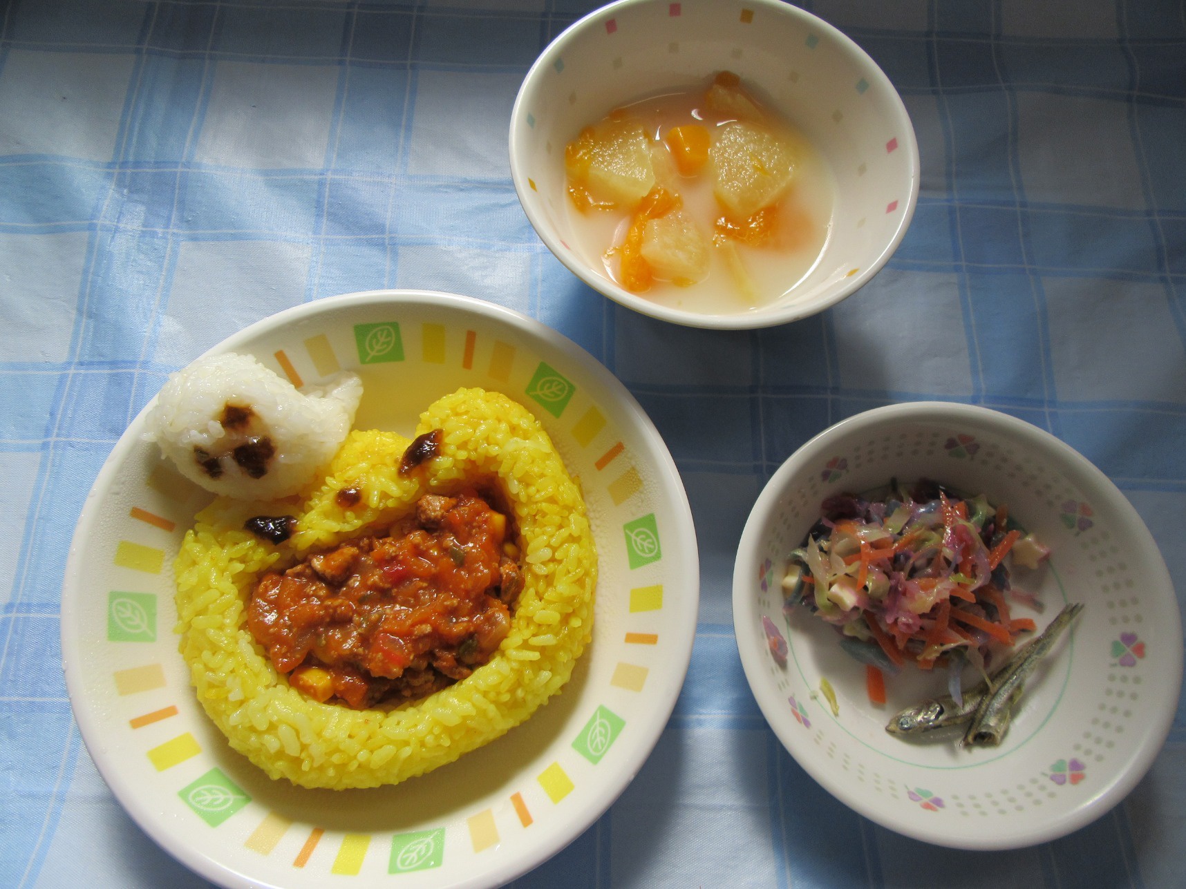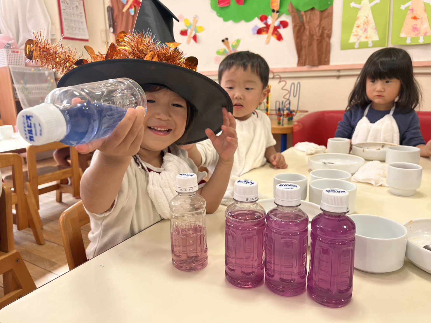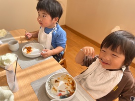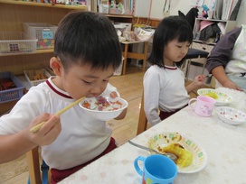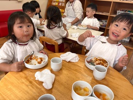 2025年10月30日(木) 給食ブログ NEW 2025.10.30 ハロウィン給食 【昼食】ドライカレーライス(幼児はターメリックライス、未満児は白ごはん)・紫キャベツの変身サラダ・カルピスフルーツポンチ・いりこ 【おやつ】野菜ジュース・おばけのカップケーキ 今日のサラダは、紫キャベツの色素と酸・アルカリの性質を利用した不思議なサラダの登場です。重曹で下茹でした紫キャベツは青色ですが、お酢入りのドレッシングをかけると…だんだんピンク色に変身します。子どもたちも色の変化にビックリしていました。メインのドライカレーはおばけの型で型抜きをして、のりの佃煮で目を描きました。紫・オレンジとハロウィンらしい色どりになるよう工夫しました。