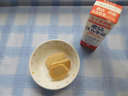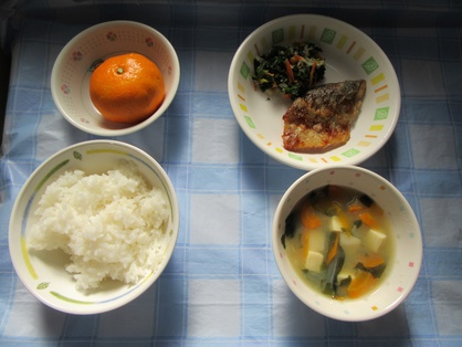 【昼食】ごはん・さばの竜田揚げ・ごま酢和え・里芋のお味噌汁・みかん・いりこ