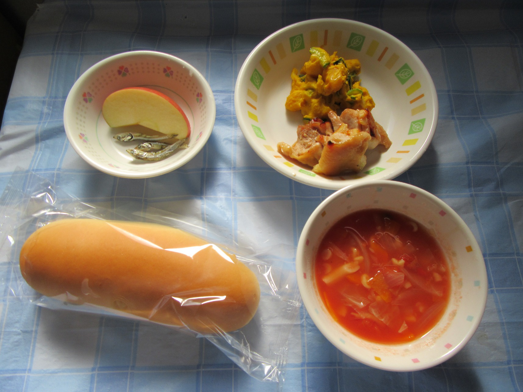 【昼食】パン・鶏肉のマーマレード焼き・かぼちゃサラダ・ミネストローネ・りんご・いりこ