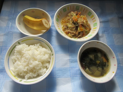 【昼食】ごはん・豚肉のすき焼き風煮・なすのお味噌汁・バナナ・いりこ