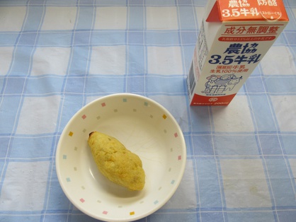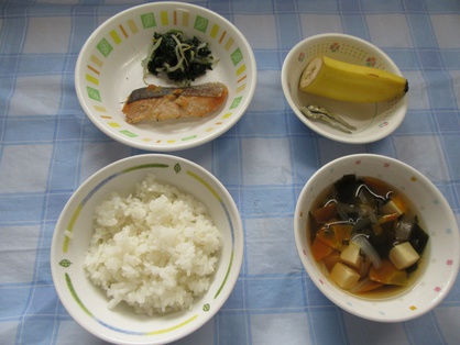 【昼食】ごはん・鮭の西京焼き・ほうれん草の和え物・豆腐のすまし汁・バナナ・いりこ