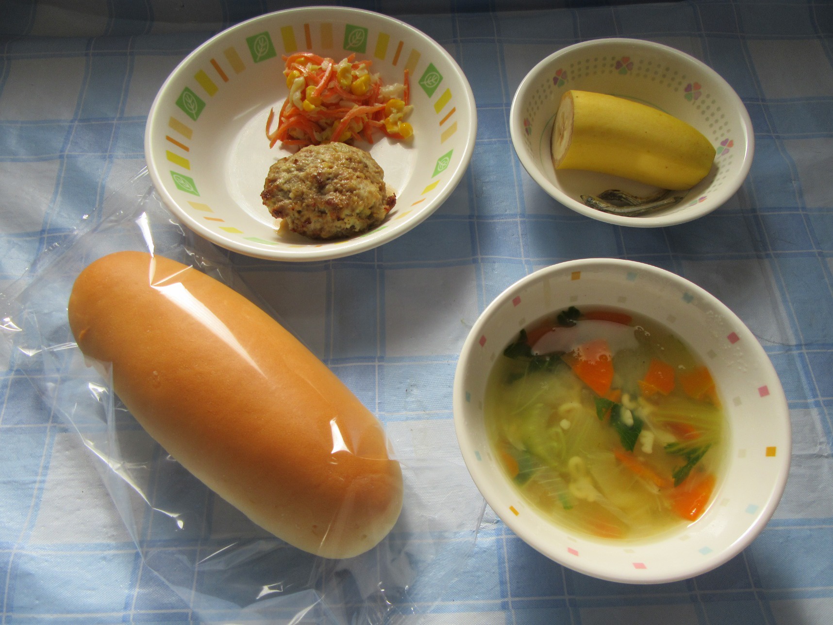 【昼食】パン・豆腐ハンバーグ・コールスローサラダ・マカロニスープ・バナナ・いりこ