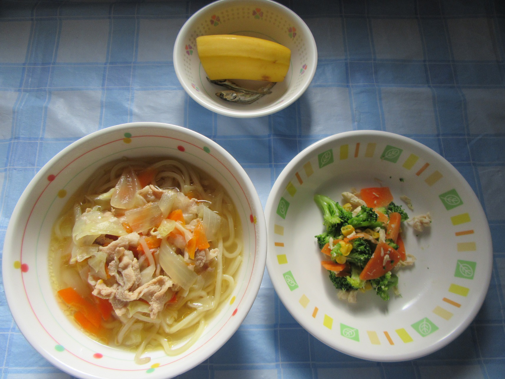 【昼食】ちゃんぽん・ブロッコリーのチキンサラダ・バナナ・いりこ