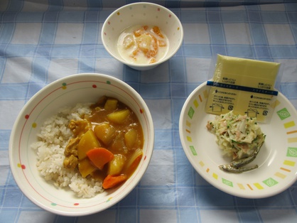 【昼食】チキンカレーライス・ツナサラダ・フルーツヨーグルト・チーズ・いりこ