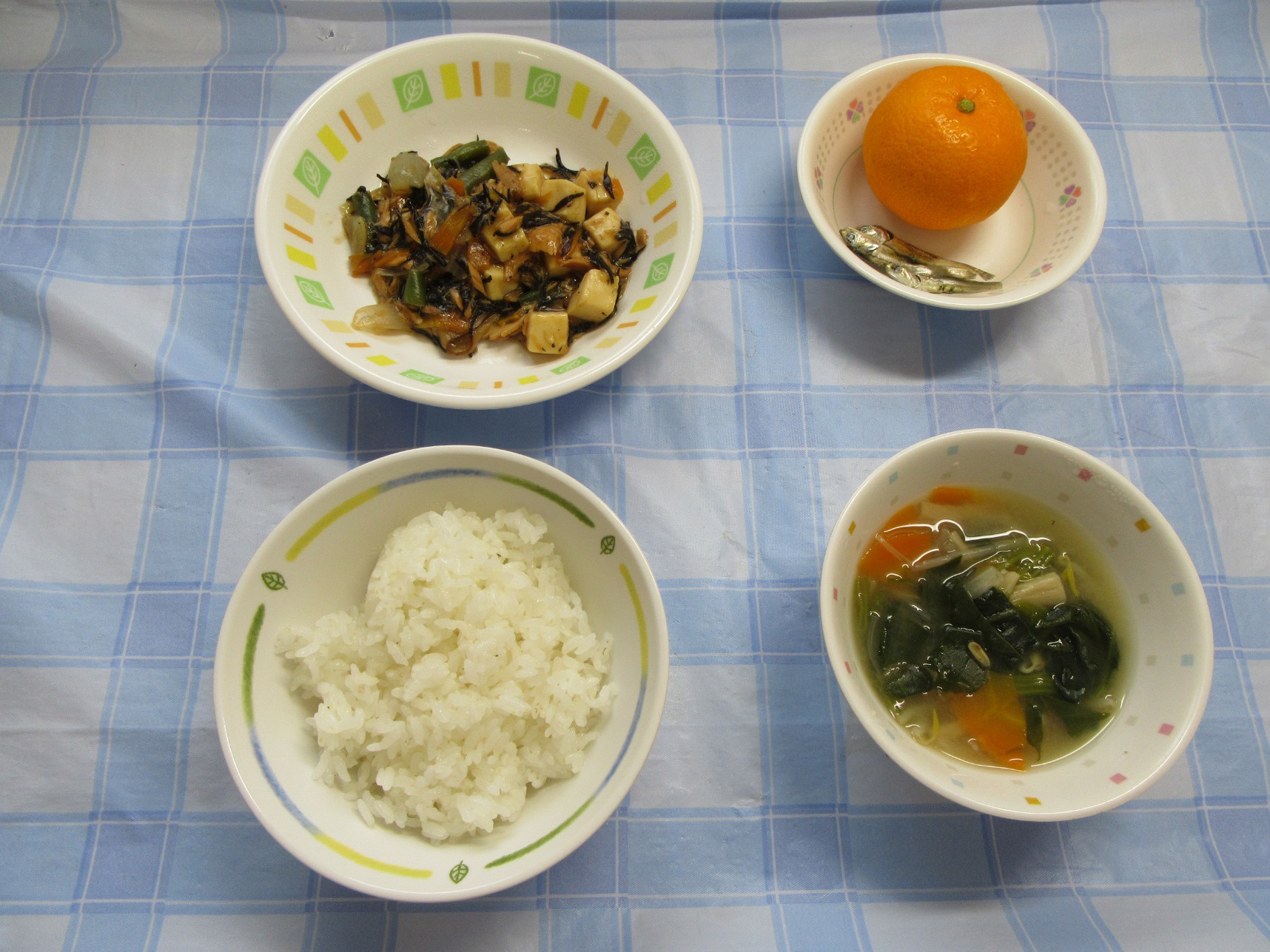 【昼食】ごはん・炒り豆腐・ほうれん草のお味噌汁・みかん・いりこ