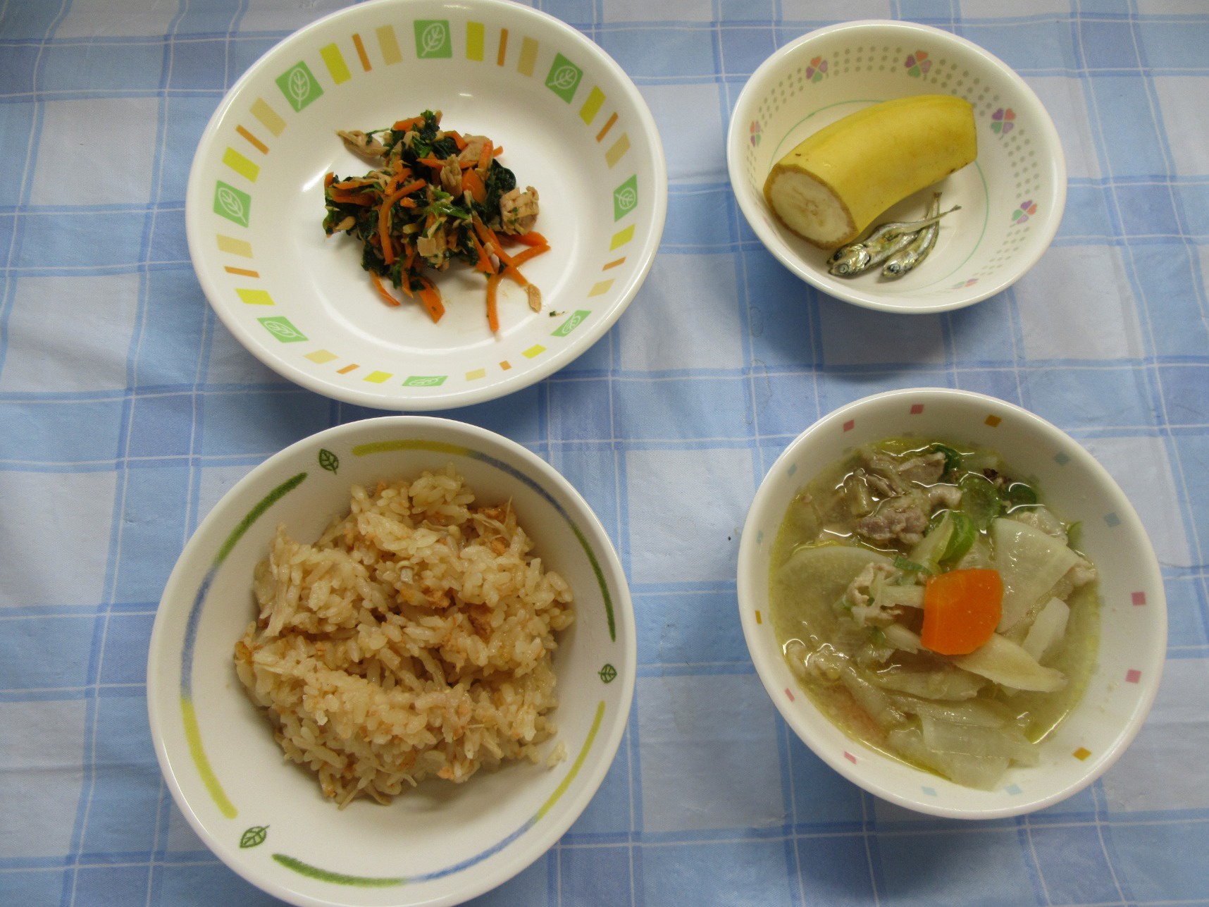 【昼食】鮭の炊き込みご飯・ほうれん草のツナ和え・豚汁・バナナ・いりこ