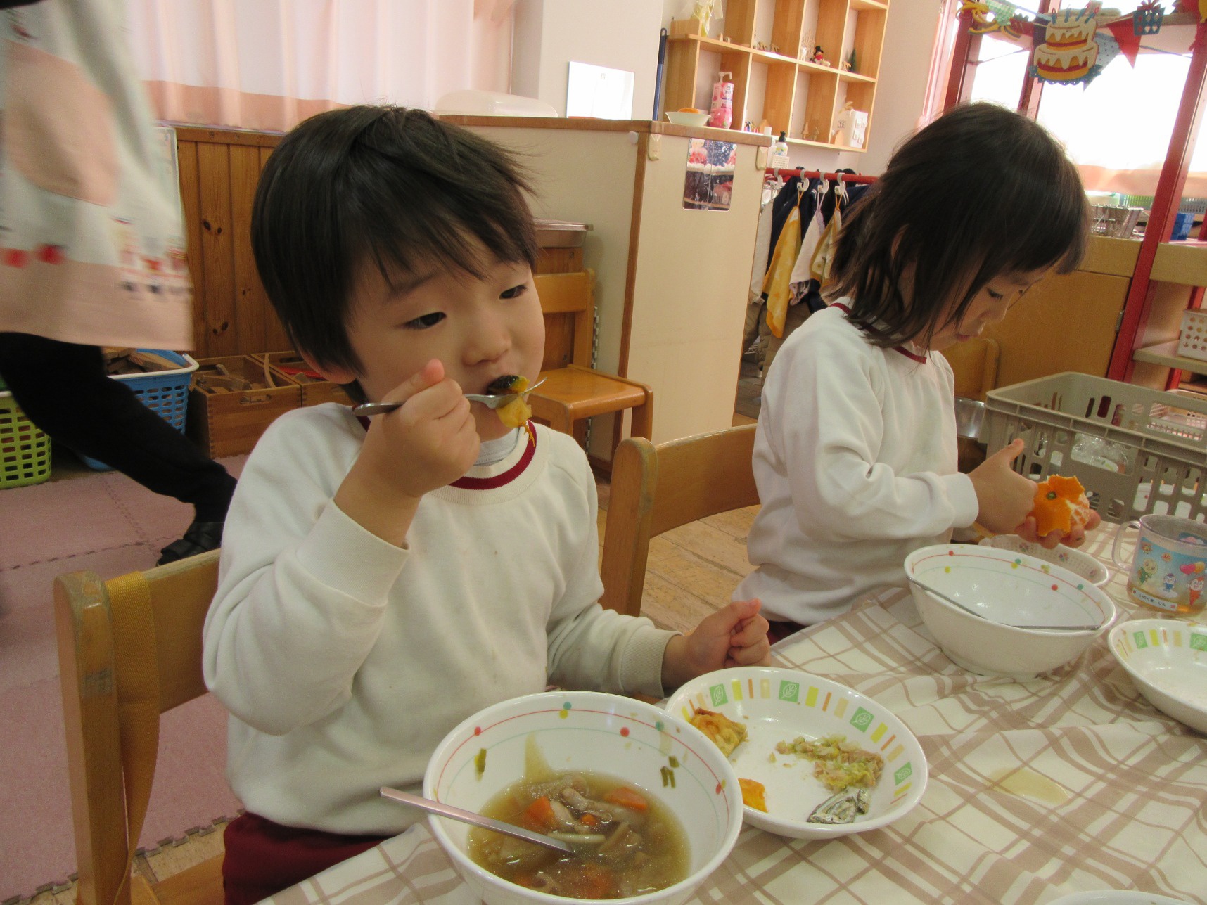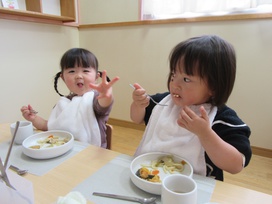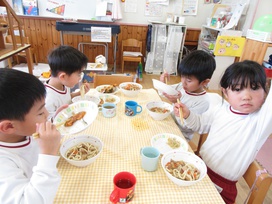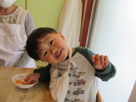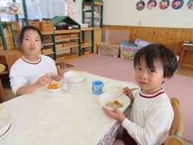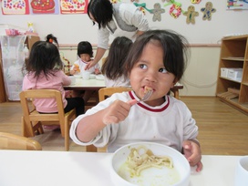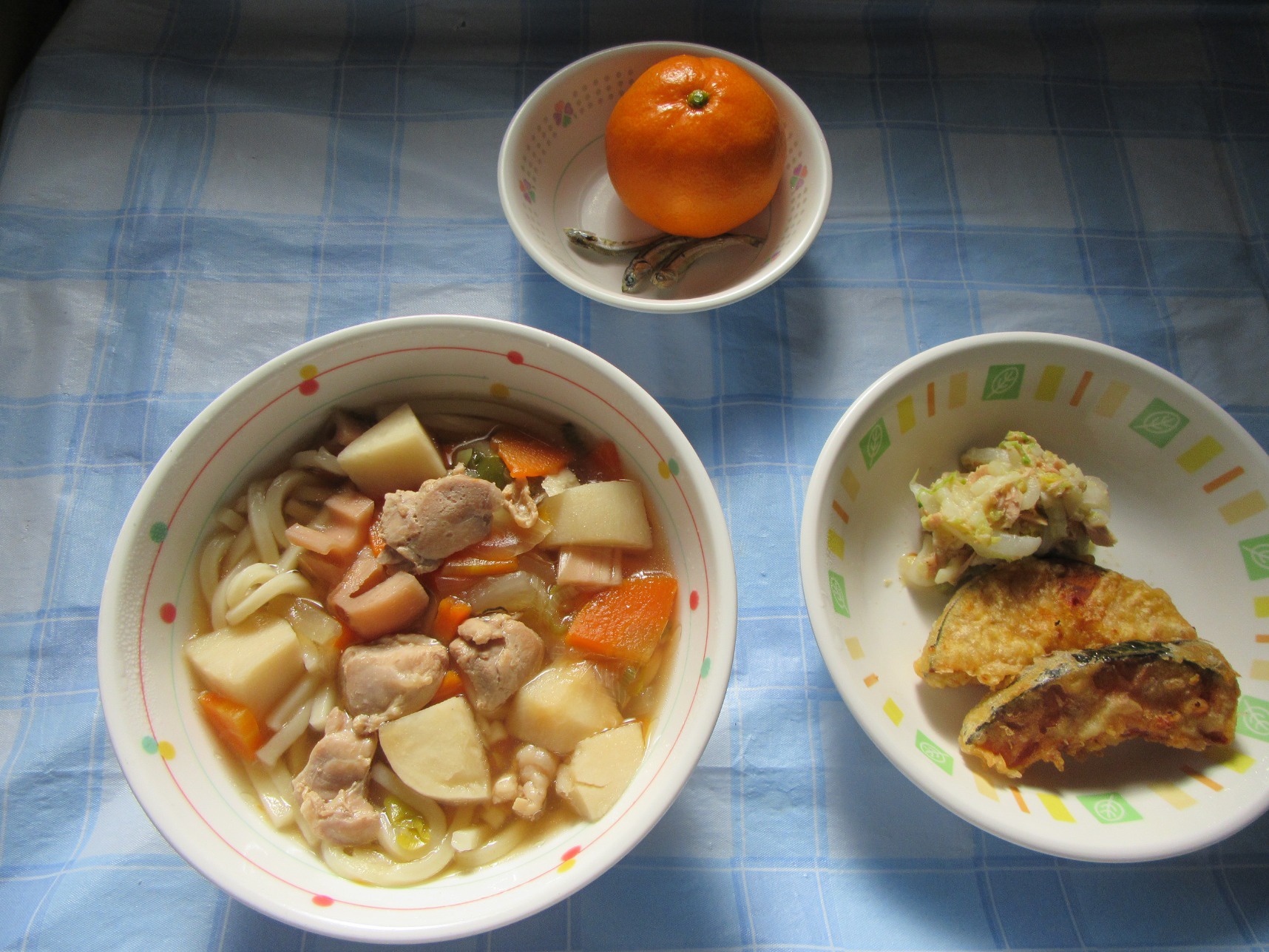 2026年01月08日(木) 給食ブログ NEW 2025.12.22 冬至 【昼食】けんちんうどん・かぼちゃの天ぷら・白菜のツナ柚子和え・みかん・いりこ 【おやつ】牛乳・塩昆布おむすび 今日は1年で最も夜が長く、昼が短い『冬至』です。冬至には「ん」がつく食べ物を食べると運が呼び込めると言われています。今日のお給食には、なんきん(かぼちゃ)・にんじん・だいこん・れんこん・うどん・みかんを使用しました。根菜は苦手な子が多いですが、大好きなうどんだと一緒によく食べていました。かぼちゃの天ぷらも大人気でした。柚子を使った和え物はいつもよりフレッシュな香りで、子どもたちも「いい匂いがするね」「ちょっと酸っぱい~」と言っていました。しっかり食べて元気も、運気もアップしますように!