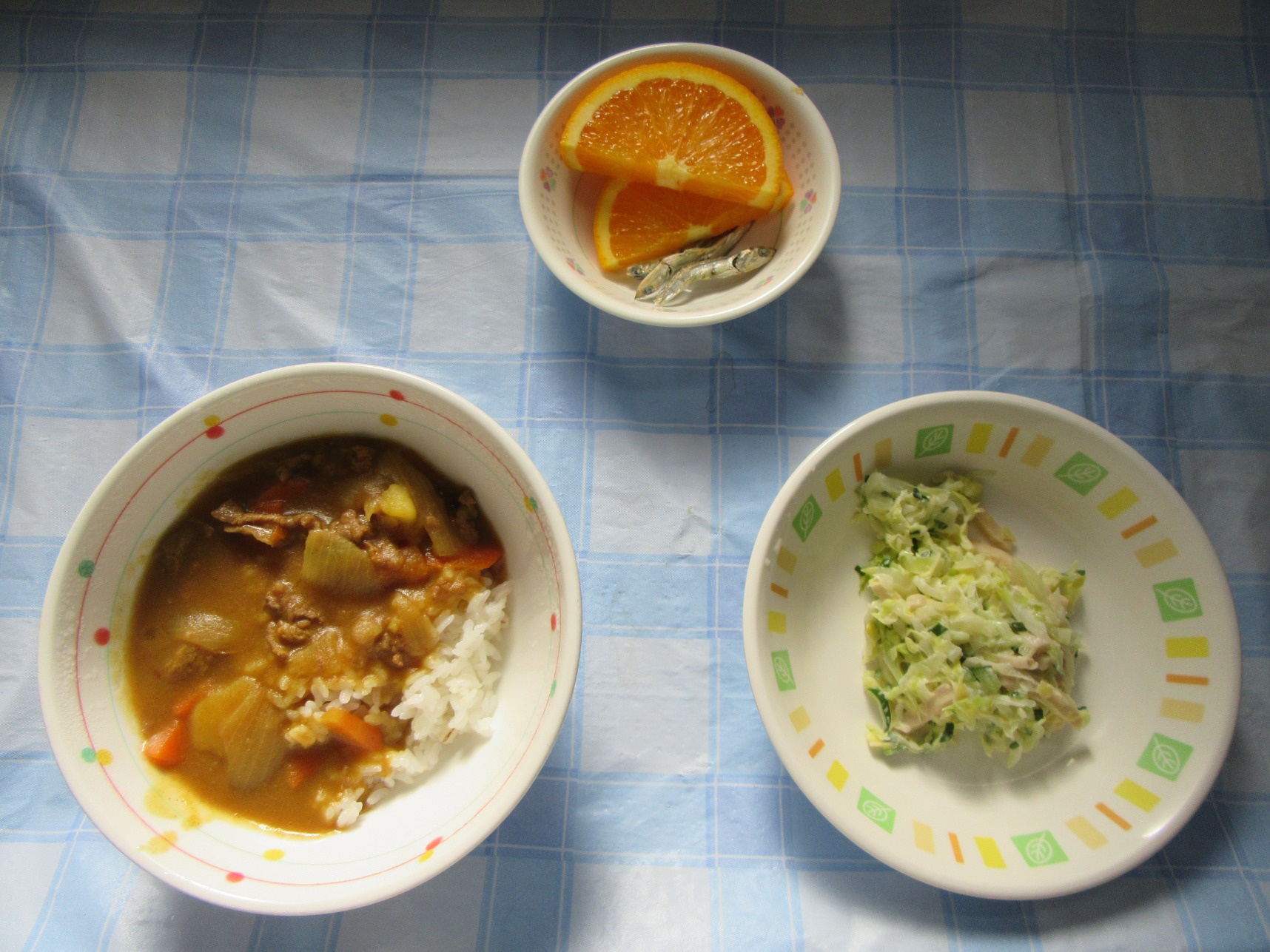 2025年12月26日(金) 給食ブログ 2025.12.26 【昼食】カレーライス・ハムサラダ・オレンジ・いりこ 【おやつ】お茶・玄米フレークスナック 今年も大変お世話になりました。来年もよろしくお願いいたします。