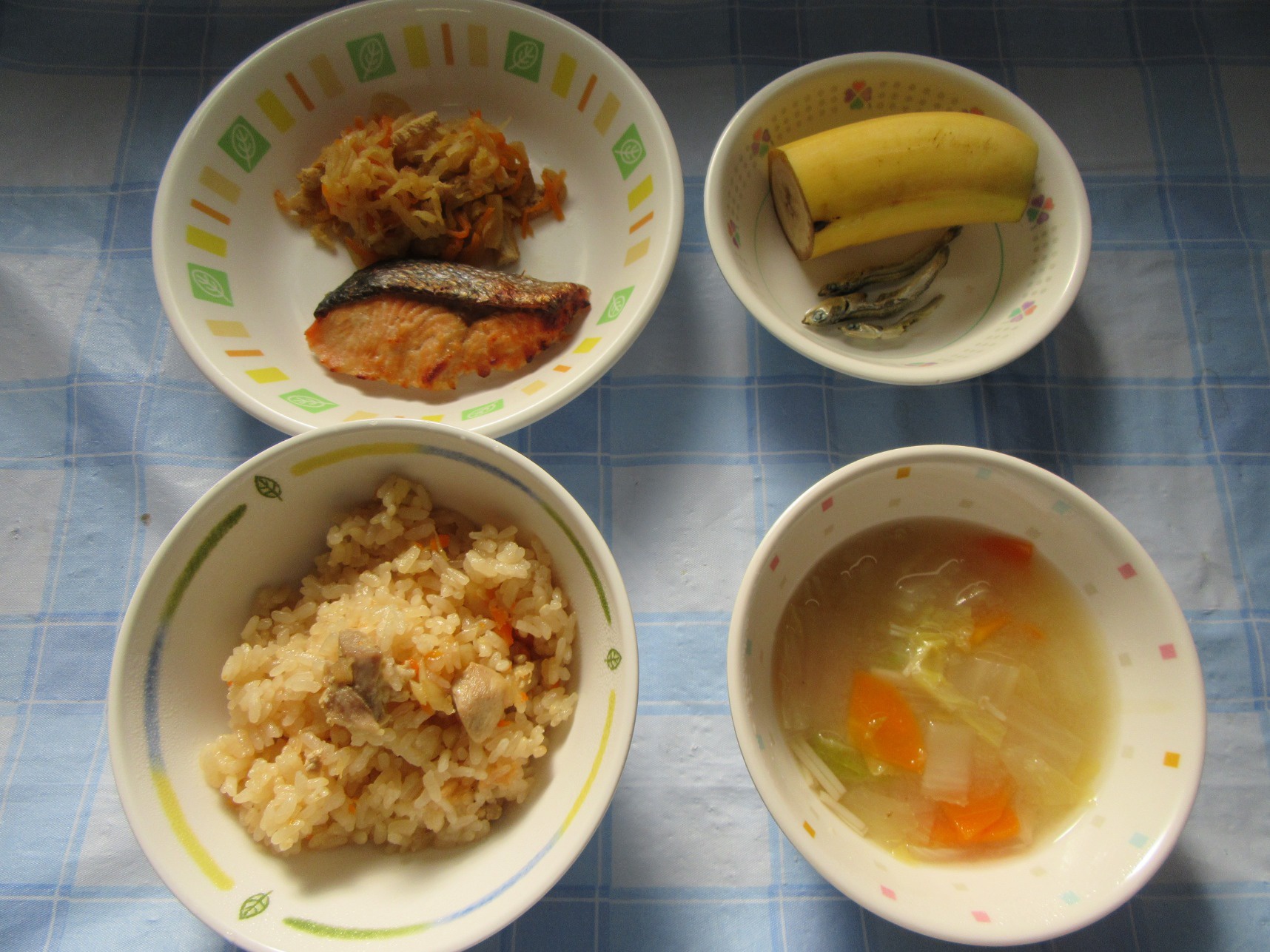 【昼食】鶏ごぼうごはん・鮭の塩麹焼き・切干大根の旨煮・白菜のお味噌汁・バナナ・いりこ