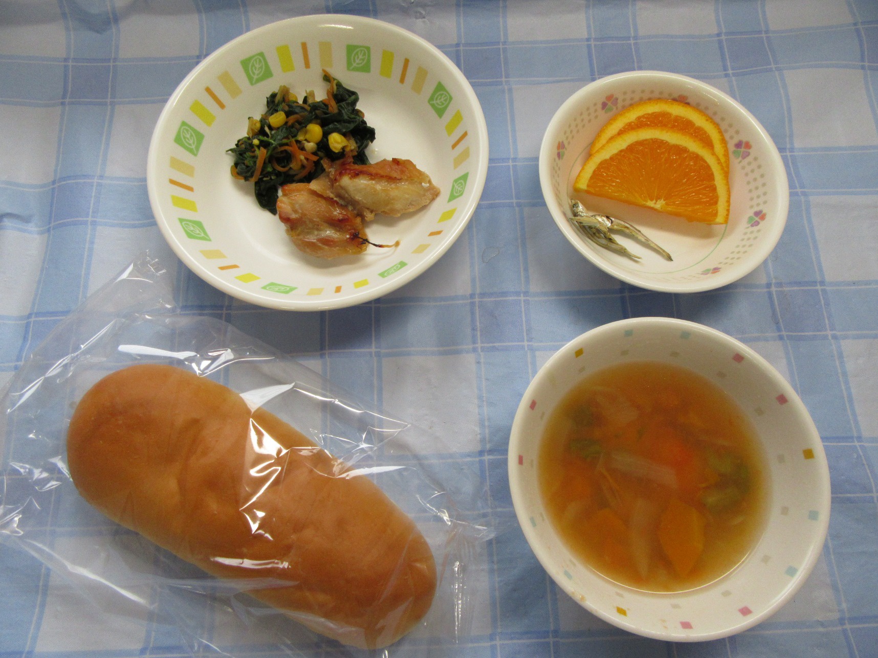 【昼食】パン・鶏肉のマーマレード焼き・ほうれん草のソテー・ミネストローネ・オレンジ・いりこ
