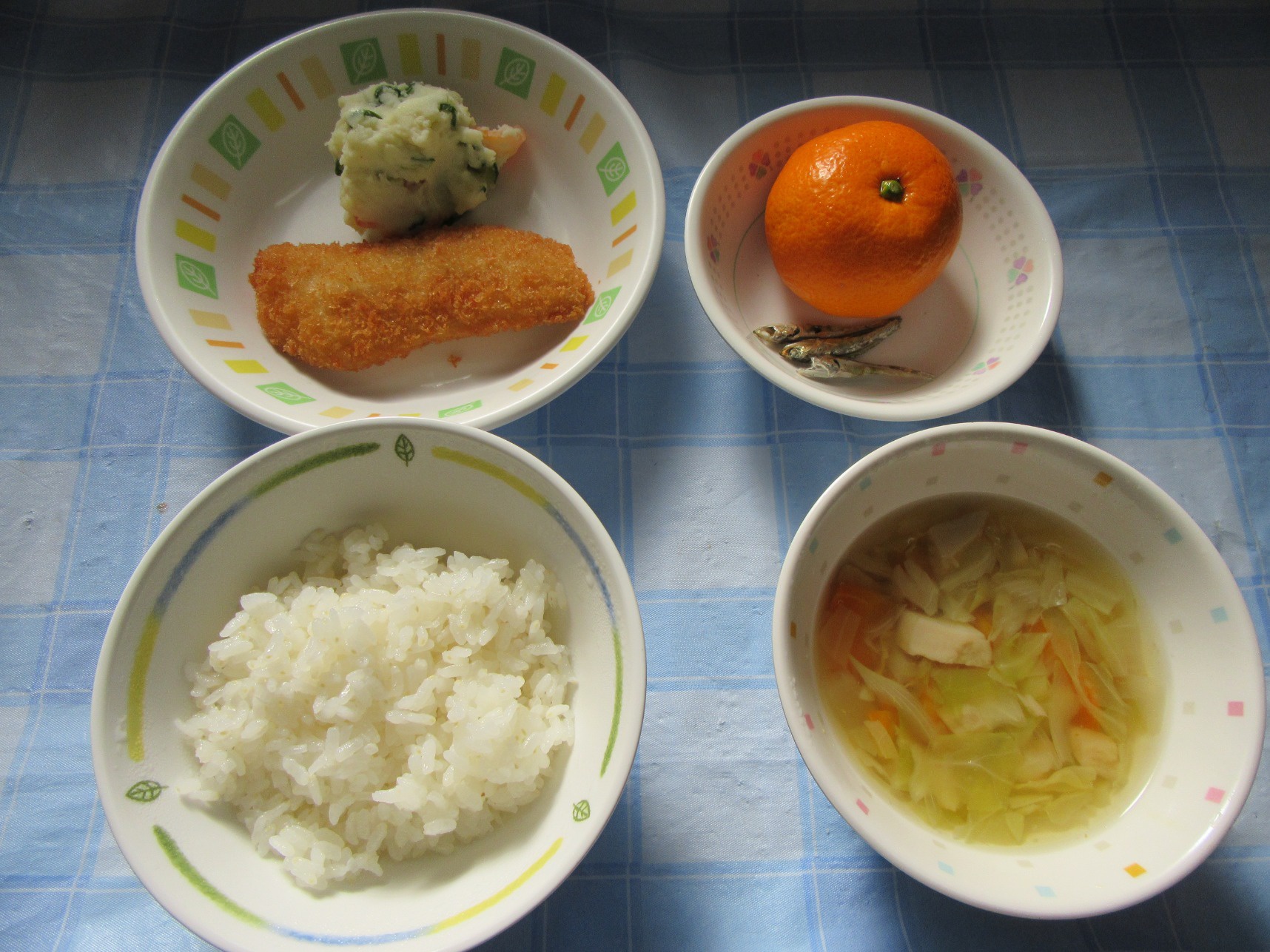 【昼食】ごはん・白身魚フライ・ポテトサラダ・野菜スープ・みかん・いりこ